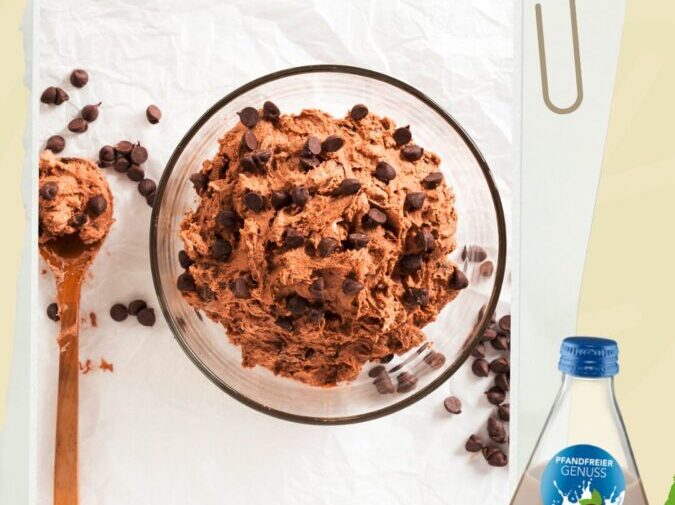 - Trockene Zutaten vermischen, dann mit Öl und Kakao-Drink zu einem glatten Teig verrühren.